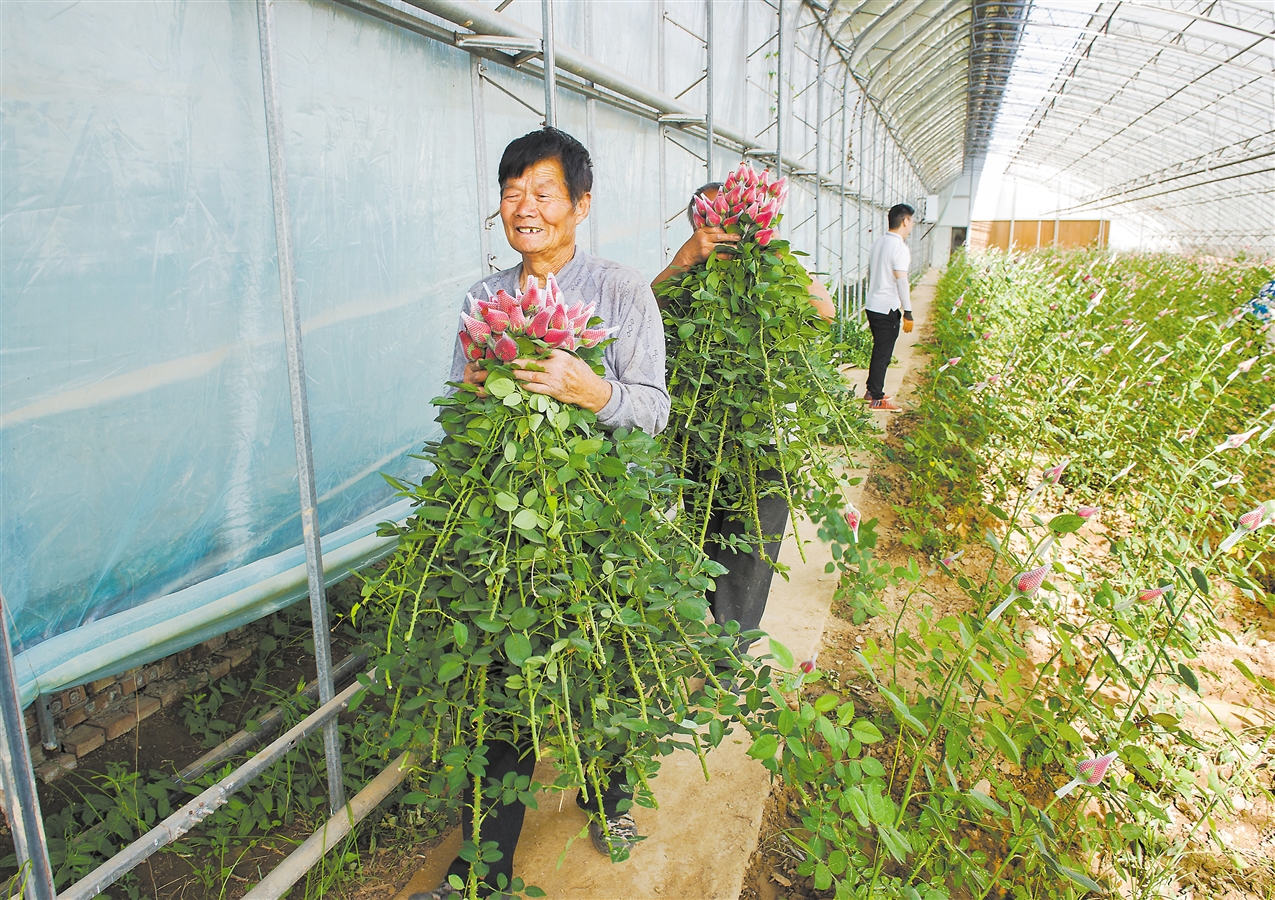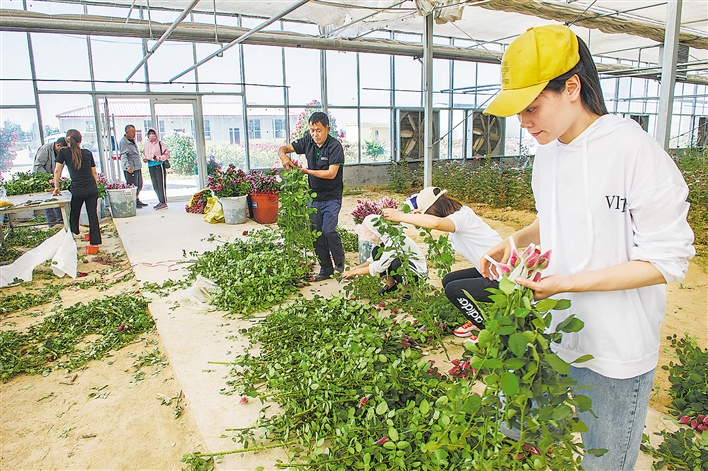 圖⑥ 正是鮮切花銷售旺季,工作人員正在銷售月季。基地每年可產(chǎn)鮮花500多萬株,創(chuàng)經(jīng)濟(jì)效益1000余萬元。