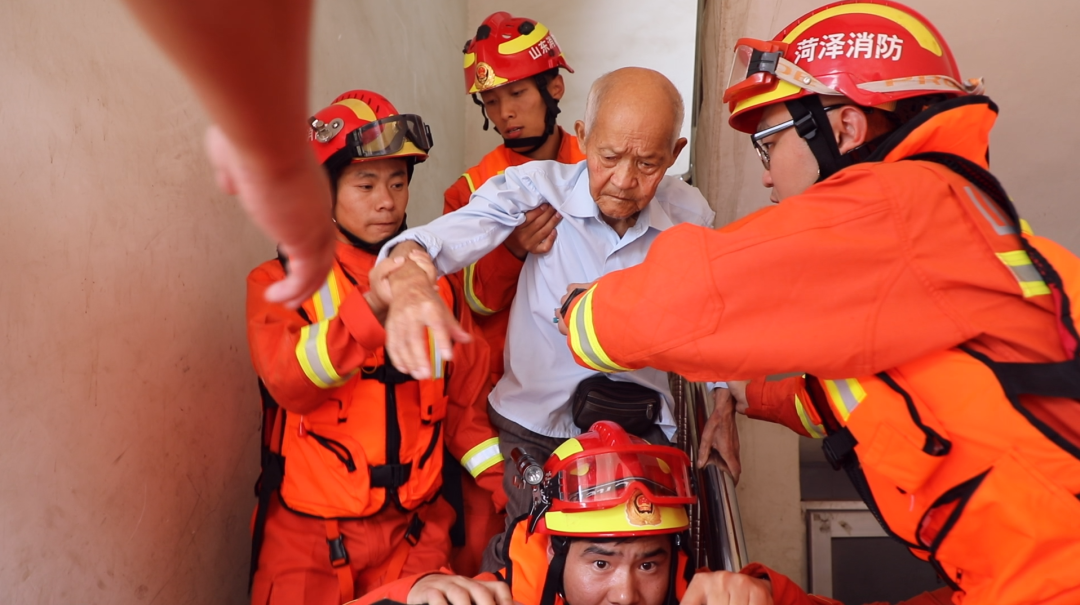 老人因為行動不便,下樓過程中雖有消防員攙扶,走起路來還是很困難。走到最下面一層階梯時,距離救生艇還有一大步的距離,此時增援隊的王振強(qiáng)一下?lián)涞乖谒C里“大爺,您從我背上踩著走過去,別怕,有我們呢!”