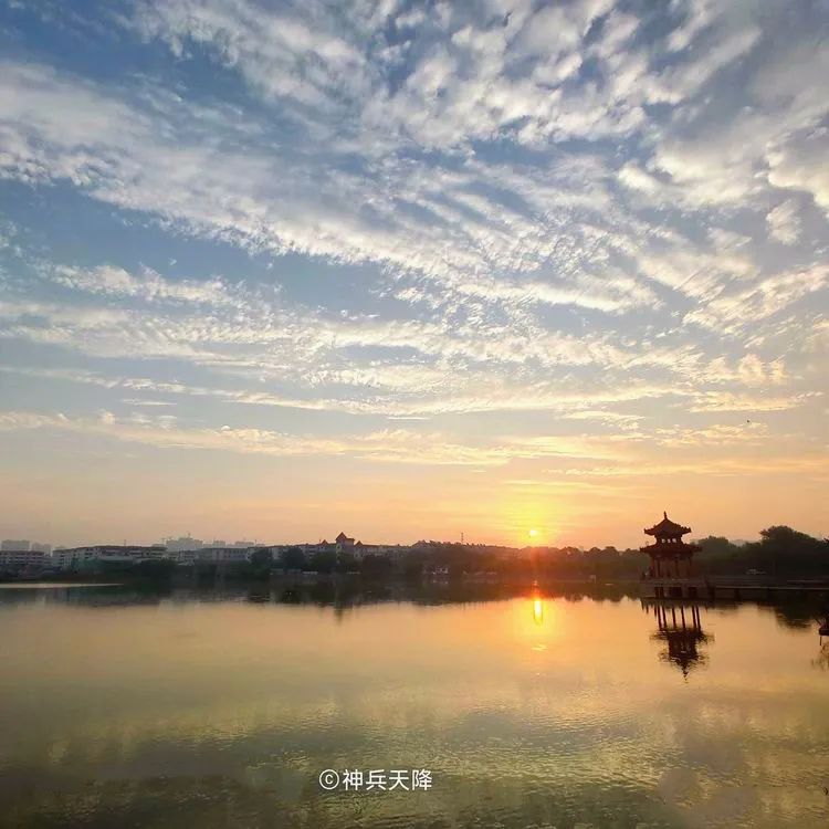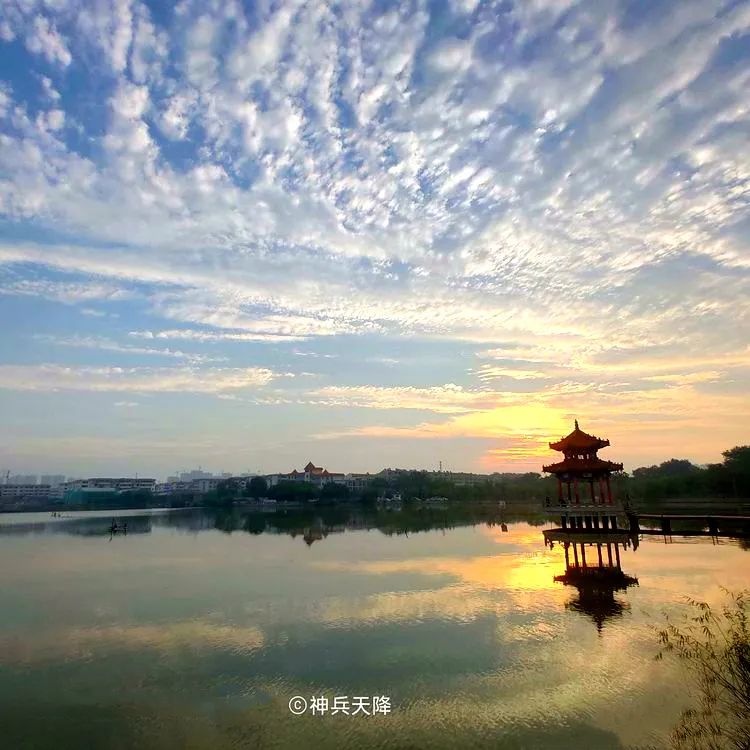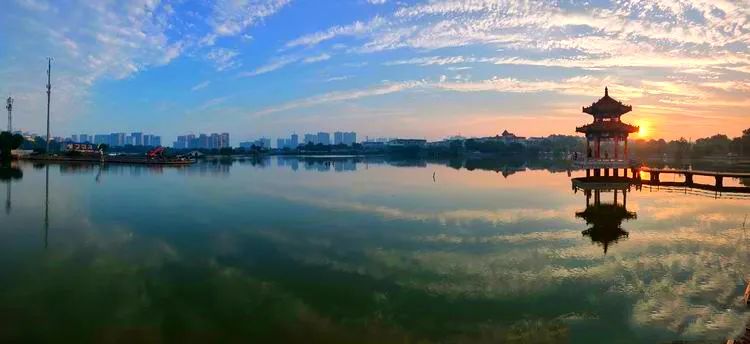 盛夏時節,青年湖湖水清澈,映著藍天白云和朝霞。