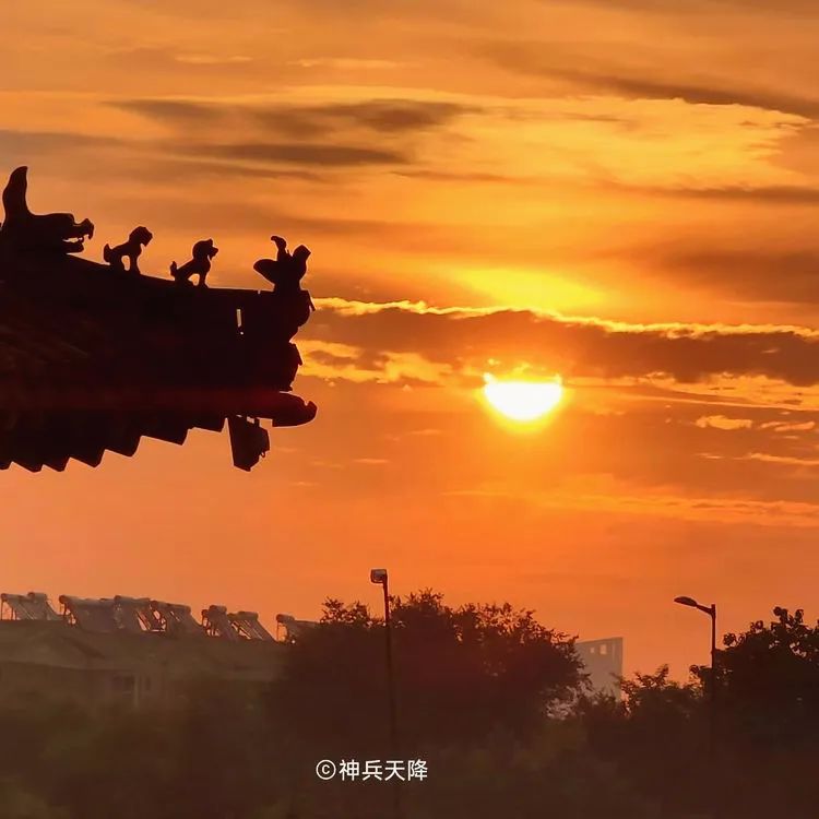 亭子上的鎮脊神獸在霞光中透著神秘。中國古代傳統建筑里,在垂脊上常見的有四個小獸,有著祈吉祥、裝飾美和保護建筑的三重功能。