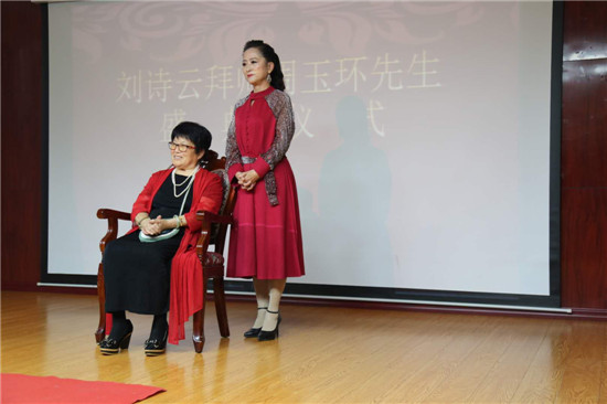 8月22日10許,牡丹區楓葉正紅金秋大學二樓多媒體室里,掌聲、戲韻、歡歌、笑語相融相撞,座無虛席,來自菏澤市各縣區的30多名老戲曲藝術家和百余名觀眾集聚在此,參加“棗梆姐”劉詩云拜周玉環先生為師儀式。