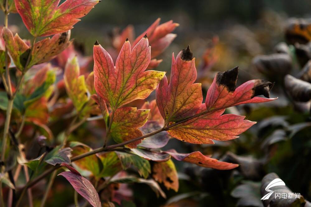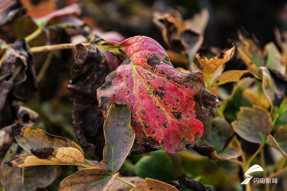古人早就說過:霜葉紅于二月花。這在牡丹園里也得到了體現。你看,不只是銀杏,還有白蠟、椿樹、槭樹、石榴、櫻花樹、構樹等,當然,還有漸漸枯萎中的牡丹的葉子,也是胸懷紅心,熠熠生輝。