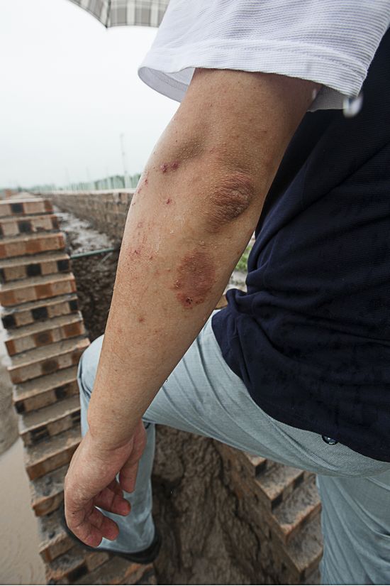 長期的大的工作量和緊繃著的工作壓力,李彥朝同志患上了神經性皮炎,有時候很癢起來只能靠安眠藥才能入睡,這是一處最讓他擔心的夾層墻工地,看到能抗擊這么大的雨他放心啦。