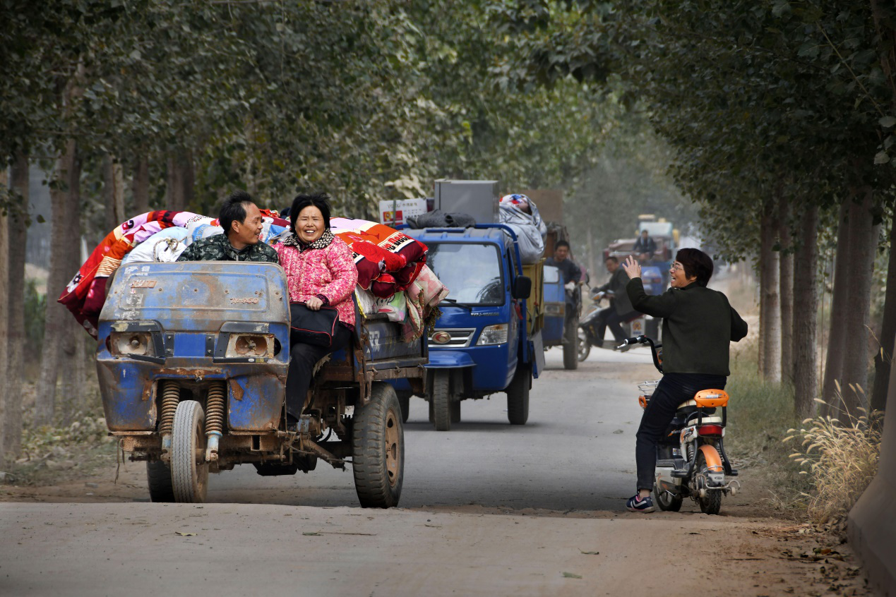 “我要搬新家啦”。2018年10月21號李進士堂鎮田樓村彭運來夫婦搬家路上和熟人打招呼,幸福掛在臉上。