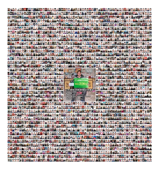 這幅歷時一個多月制作的《助力脫貧 “保險”攻堅---菏澤市貧困人口醫療商業補充保險脫貧攻堅故事》巨幅作品,照片的正中間是菏澤市最大理賠款319408.79元孫喜連家里的影像資料,周圍是從2017年1月1日至全國扶貧日10月17日這天,全菏澤市貧困人口醫療商業補充保險理賠額超過山東省貧困線3509元貧困人口的照片,每幅照片下面的數字是理賠金額,精確到人民幣分,我選了脫貧攻堅的兩個重要數據,時間節點1017和金額節點3509,使得作品更有戲劇性。作品真實直觀的反映出菏澤市貧困人口醫療商業補充保險切實解決了貧困人口因病致貧、因病返貧問題,可以說菏澤市實施的貧困人口醫療商業補充保險在護航脫貧攻堅戰中功不可沒!