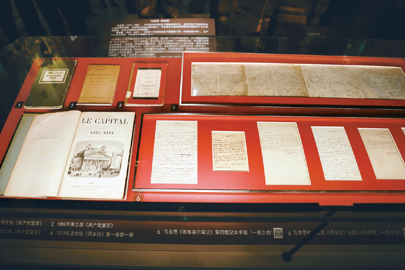 中國共產黨歷史展覽館的展廳里,陳列著多份珍貴的馬克思手稿。右上為馬克思《布魯塞爾筆記》第四筆記本手稿;右下為馬克思寫給《資本論》法文版出版人的六封書信。 中新社發 陳曉根/攝