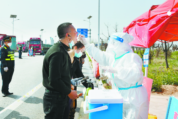3月23日,在曹縣220國道卡點,防控工作人員對市外入菏返菏人員進行測溫、驗碼、核酸檢測。據(jù)悉,我市落實落細疫情防控各項措施,加強高速、國省道、火車站、高鐵站、機場等交通關口管控,對往來車輛和人員全面篩查,做到“應檢盡檢”,切實筑牢外防輸入防線。記者 張 嘯 攝