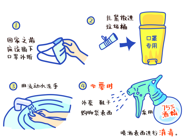 常更換 口罩弄濕或弄臟后應及時更換,廢棄口罩應投到專用的口罩收集箱或收集點。