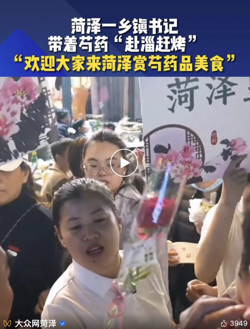 政府方面:今年五一期間,菏澤一鄉鎮書記帶著芍藥“赴淄趕烤”的視頻也流傳開來,“歡迎大家來菏澤賞芍藥品美食”,據了解,這是菏澤市牡丹區皇鎮鄉鎮書記為推廣當地芍藥,帶隊攜芍藥赴淄博開展的推廣活動。視頻中,鄉鎮書記操著生澀的菏普賣力推薦,如此接地氣的形象擊中了一眾網友的心。