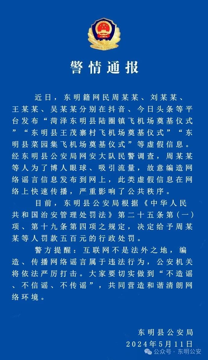 無獨有偶,近日,菏澤市公安局定陶分局網安大隊、黃店派出所接到網民舉報,稱有人在網上發布“黃店機場奠基儀式”虛假視頻。經調查發現,原視頻為福建省寧德市某科技中心項目奠基儀式視頻,網民為博取眼球獲得流量和點贊,將視頻修改剪輯發布虛假信息。違法人員何某、王某對編造散布謠言一事供認不諱,并刪除虛假視頻。違法人何某、王某被依法予以行政處罰。