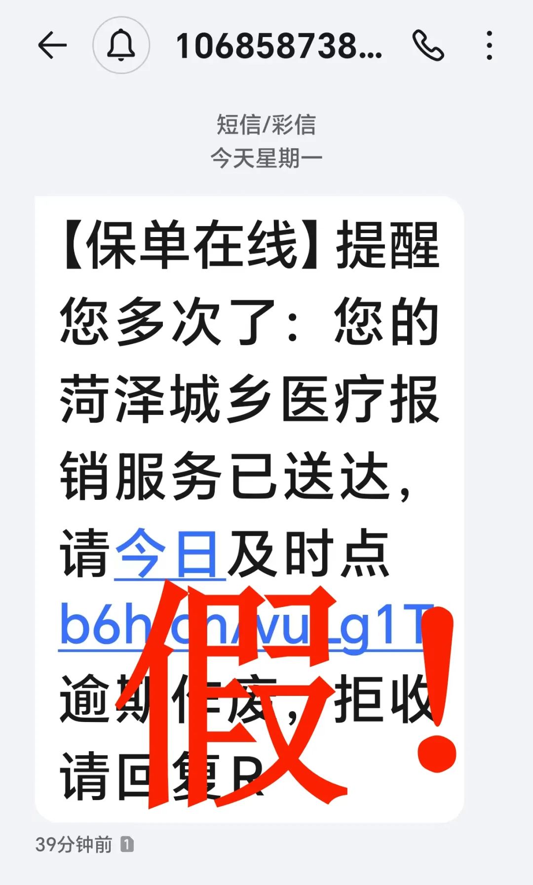 短信內(nèi)容為“您的城鄉(xiāng)醫(yī)療報銷服務(wù)已送達,請點擊鏈接”