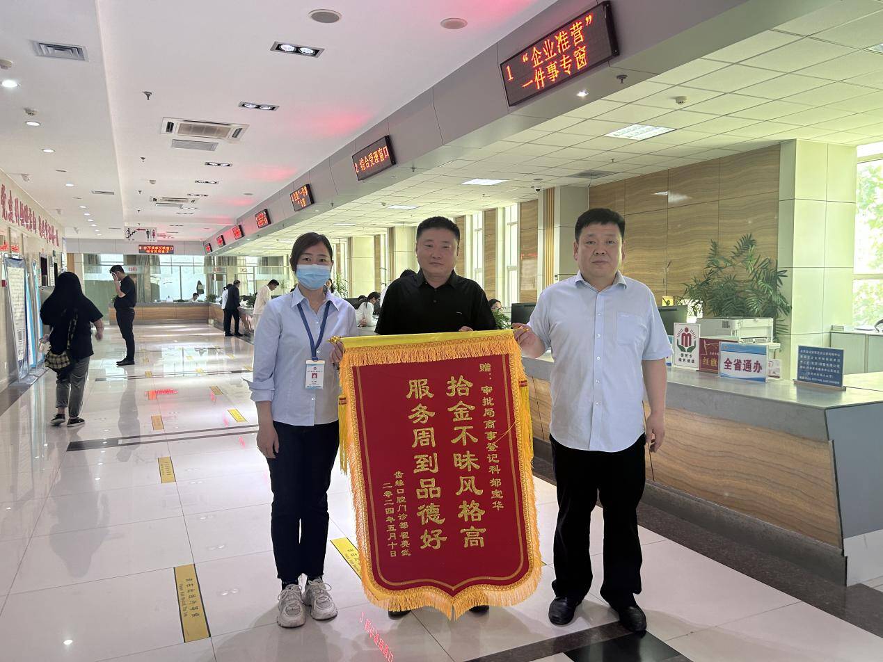 “真是太感謝你們了。”5月13日,翟先生攜一面錦旗到政務(wù)服務(wù)大廳企業(yè)開辦窗口對拾金不昧的工作人員表示感謝。