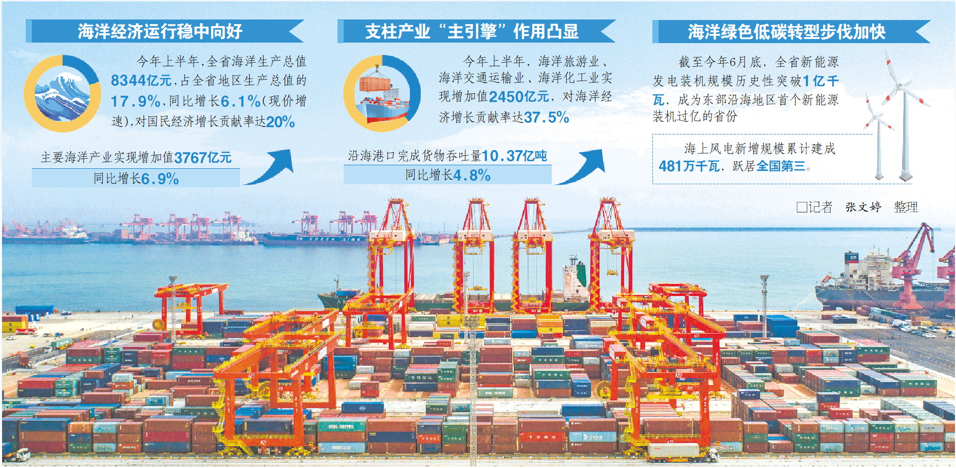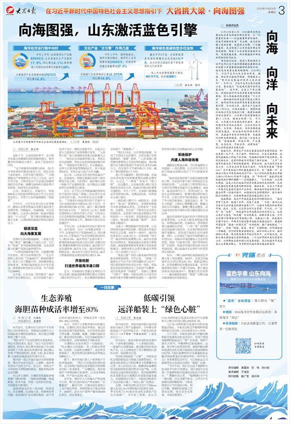 近日,中國船級社質量認證有限公司向山東港口渤海灣港集團濰坊港正式頒發《碳中和評價證書》,標志著濰坊港建成全國首個“零碳港口”。 “我們以風電、光伏等清潔能源,完成了對傳統火電的替代,目前全港已實現能源綠色‘零碳’排放。”山東省港口集團濰坊港有限公司總經理孫超說,清潔能源不僅為濰坊港每年節省用電成本約960萬元,而且每年可節省標煤2.1萬噸、減少二氧化碳排放5.7萬噸。 港口作為基礎性、樞紐性設施,在海洋經濟發展中發揮著重要的戰略支撐作用。從過去“一群港”到如今“港口群”,經過整合,山東海洋港口群已成為我國東西雙向互濟、陸海內外聯動的重要交通樞紐。今年上半年,全省港口新增海運外貿航線13條,總數達255條,居我國北方港口首位。 一流的港口離不開一流的技術。全球首個“氫+5G”智慧碼頭、全球首創智能空中軌道集疏運系統、全球首創“全系統、全流程、全自動”干散貨專業化碼頭控制技術、全國首個液化油品智腦生產管控系統……一批全球、全國首創在山東港口誕生,推動港口越來越“聰明”,綜合效能大幅提升。 從港口一隅放眼海洋發展全景,山東持續深化海洋科技創新,推進高水平海洋科技自立自強。2021年—2023年,海洋科技資金投入達36.5億元;約有50家“國字號”海洋科研機構集聚山東;海空信息感知與處理技術、極地深海信息感知與智能探測、深海裝備智聯網等省重點實驗室獲批建設;擁有20多位全職住魯海洋界院士,約占全國的三分之一。 “真金白銀”的投入換來海洋科技創新成果競相涌現。今年以來,“深海一號超深水大氣田開發工程關鍵技術與應用”項目獲國家科學技術進步獎一等獎;青島藍色種業研究院攻關三文魚國產化繁育,成功實現誘導“偽雄魚”,突破人工繁育“卡脖子”難題;中船發動機公司成功交驗國內首臺甲醇雙燃料低速機……海洋科技優勢正轉化為經略海洋的山東實踐。