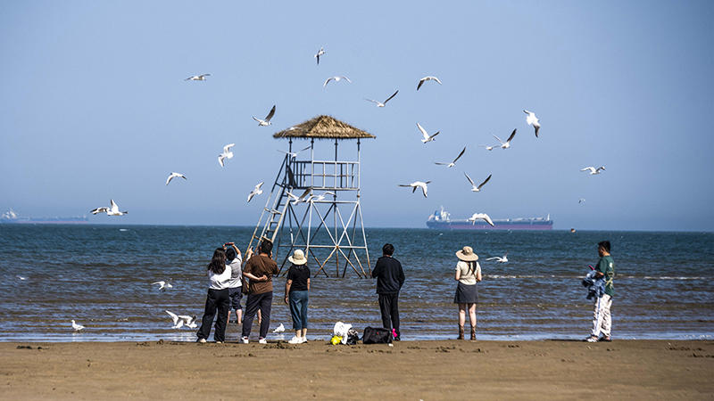2024年5月12日,河北秦皇島,北戴河鴿子窩公園成群海鷗在天空中自由翱翔,與大海、藍天構成了一幅美麗的畫卷。
