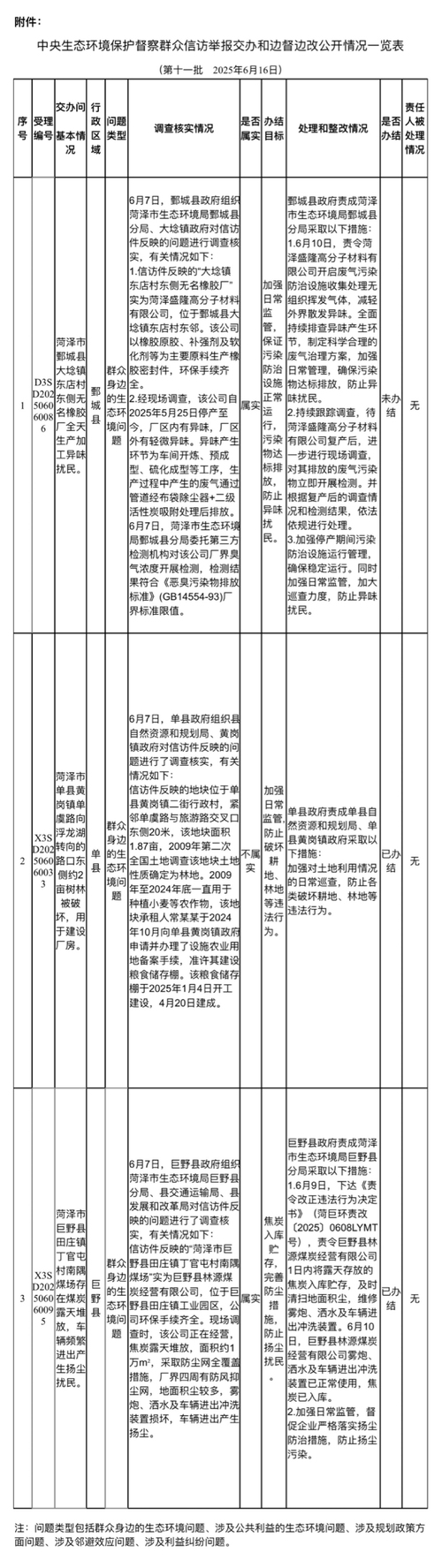 截至6月16日,中央第三生態環境保護督察組轉辦我市的第十一批3件信訪件,已辦結2件,正在辦理1件。其中責令整改1家。根據督察要求,現予以公開。